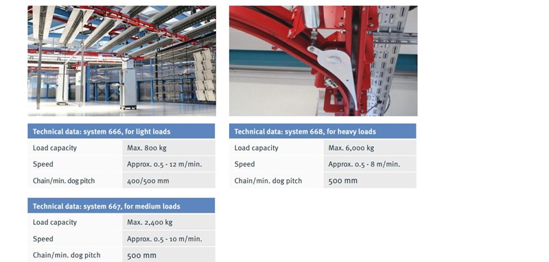 Tài liệu gốc của hãng Eisenmann mô tả Power & Free là một hệ thống đa năng – sáng tạo – mạnh mẽ, cho phép vận chuyển tải trọng từ nhẹ tới cực nặng, từ vài trăm đến 6.000 kg cho mỗi trolley.