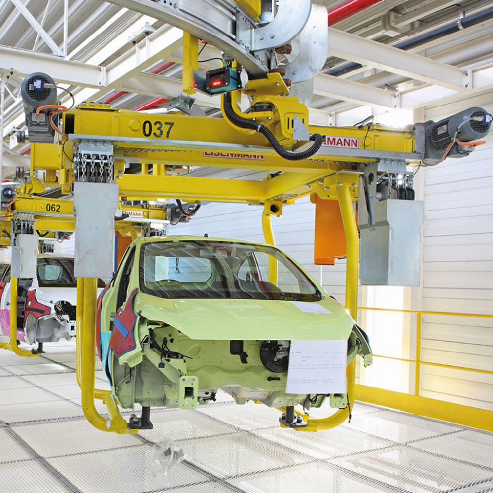 Đây là hệ thống monorail điện tải nặng được chứng minh hiệu quả vượt trội trong việc vận chuyển thân xe ô tô (car body), module nội thất – ngoại thất và các cụm linh kiện trong dây chuyền lắp ráp. Hầu hết các hãng lớn như Toyota, Volkswagen, Hyundai, Ford, và đặc biệt là VinFast tại Việt Nam đều ứng dụng loại electric monorail conveyor này cho khu vực lắp ráp thân xe cuối cùng.