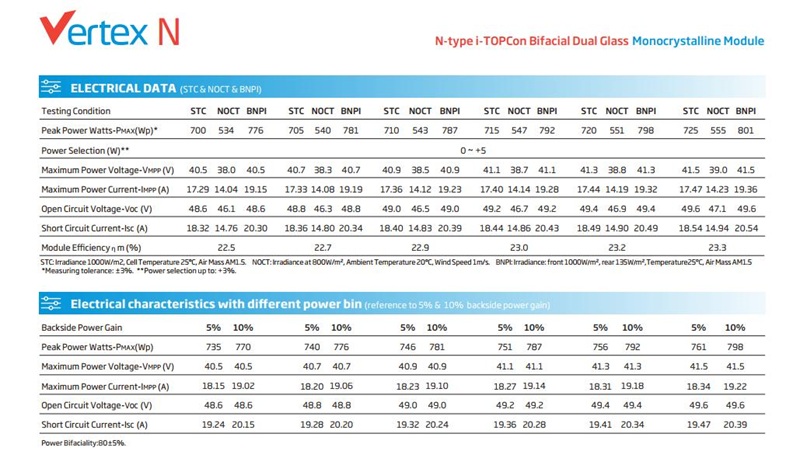Dựa trên toàn bộ thông số kỹ thuật trong tài liệu gốc từ Trina Solar, có thể khẳng định rằng Vertex N 700–725W là một trong những tấm pin mặt trời hiệu suất cao, độ bền vượt trội và tối ưu chi phí nhất hiện nay.